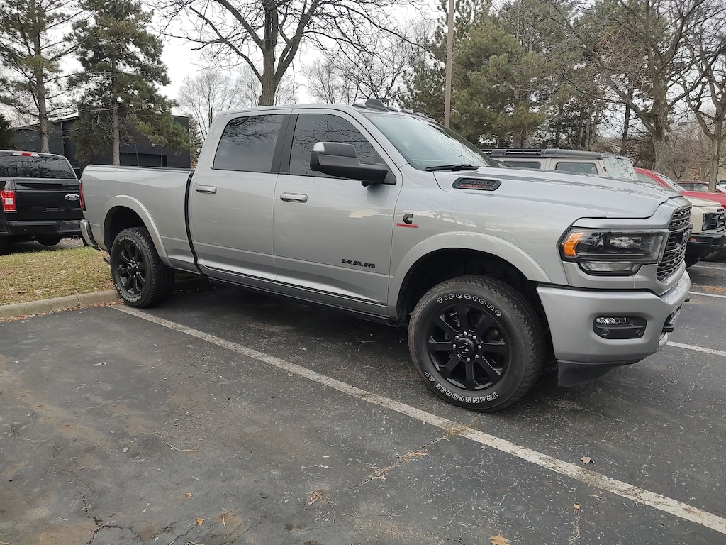 1-Year SiriusXM Guardian Trial, 10 Speakers, 12" Touchscreen Display, 17 Speaker harman kardon Premium Sound, 220 Amp Alternator, 3.73 Axle Ratio, 4-Wheel Disc Brakes, 4G LTE Wi-Fi Hot Spot, ABS brakes, Active Noise Control System, Adaptive Cruise Control w/Stop, Adaptive Steering System, Adjustable pedals, Air Conditioning, Air Suspension Decal, Alloy wheels, AM/FM radio: SiriusXM with 360L, Apple CarPlay, Apple CarPlay/Android Auto, Audio memory, Auto High-beam Headlights, Auto Level Rear Air Suspension, Auto-dimming Rear-View mirror, Automatic temperature control, Black Exterior Mirrors, Black Exterior Truck Badging, Black Grille Limited, Black Headlamp Bezels, Black Ram Head Tailgate Badge, Black Tail Lamp Bezels, Black Wheel Center Hub, Body Color Door Handles, Body Color Grille Surround, Bodyside moldings, Brake assist, Bumpers: chrome, Clearance Lamps, Cold Weather Group, Compass, CTR Stop Lamp w/Cargo View Camera, Dash Pass Thru Wire Circuits, Delay-off headlights, Digital Rearview Mirror, Disassociated Touchscreen Display, Driver door bin, Driver vanity mirror, Dual front impact airbags, Dual front side impact airbags, Electronic Stability Control, Electronically Controlled Throttle, Emergency communication system: SiriusXM Guardian, Engine Block Heater, Exterior 115V AC Outlet, Front anti-roll bar, Front Bucket Seats, Front Center Armrest w/Storage, Front dual zone A/C, Front fog lights, Front License Plate Bracket, Front reading lights, Full Speed Forward Collision Warning Plus, Fully automatic headlights, Garage door transmitter, Genuine wood console insert, Genuine wood dashboard insert, Genuine wood door panel insert, Google Android Auto, GPS Antenna Input, GPS Navigation, HD Radio, Heated door mirrors, Heated front seats, Heated rear seats, Heated steering wheel, I/P Mounted Auxiliary Switches, Illuminated entry, Integrated Voice Command w/Bluetooth, Lane Keep Assist, Leather steering wheel, Limited Leather Bucket Seats, Limited Level 1 Equipment Group, Low tire pressure warning, Memory seat, MOPAR Winter Front Grille Cover, Navigation System, Night Edition, Occupant sensing airbag, Outside temperature display, Overhead airbag, Overhead console, Painted Front Bumper, Painted Rear Bumper, Panic alarm, ParkView Rear Back-Up Camera, Passenger door bin, Passenger vanity mirror, Pedal memory, Pickup Box, Power Black Tow Mirrors w/Convex Spotter & Memory, Power door mirrors, Power driver seat, Power passenger seat, Power steering, Power Sunroof, Power windows, Quick Order Package 21M Limited, Radio data system, Radio: Uconnect 12.0 w/Navigation, Rain sensing wipers, RamBox Delete, Rear reading lights, Rear seat center armrest, Rear step bumper, Rear window defroster, Remote keyless entry, Security system, Selectable Tire Fill Alert, SiriusXM Satellite Radio, SiriusXM Traffic Plus, SiriusXM Travel Link, SiriusXM w/360L, Snow Chief Group, Speed control, Split folding rear seat, Steering wheel mounted audio controls, Surround View Camera System, Tachometer, Tilt steering wheel, Tip Start, Tow Hooks, Traction control, Trailer Reverse Guidance, Trip computer, Turn signal indicator mirrors, Variably intermittent wipers, Ventilated front seats, Voltmeter, Wheels: 20" x 8.0" Cast Aluminum Black, Wheels: 20" x 8.0" Satin Carbon w/Chrome Insert.
